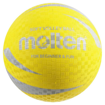 - Miękka gumowa piłka do siatkówki marki Molten model S2V1250-Y przeznaczona dla graczy początkujących i dzieci.